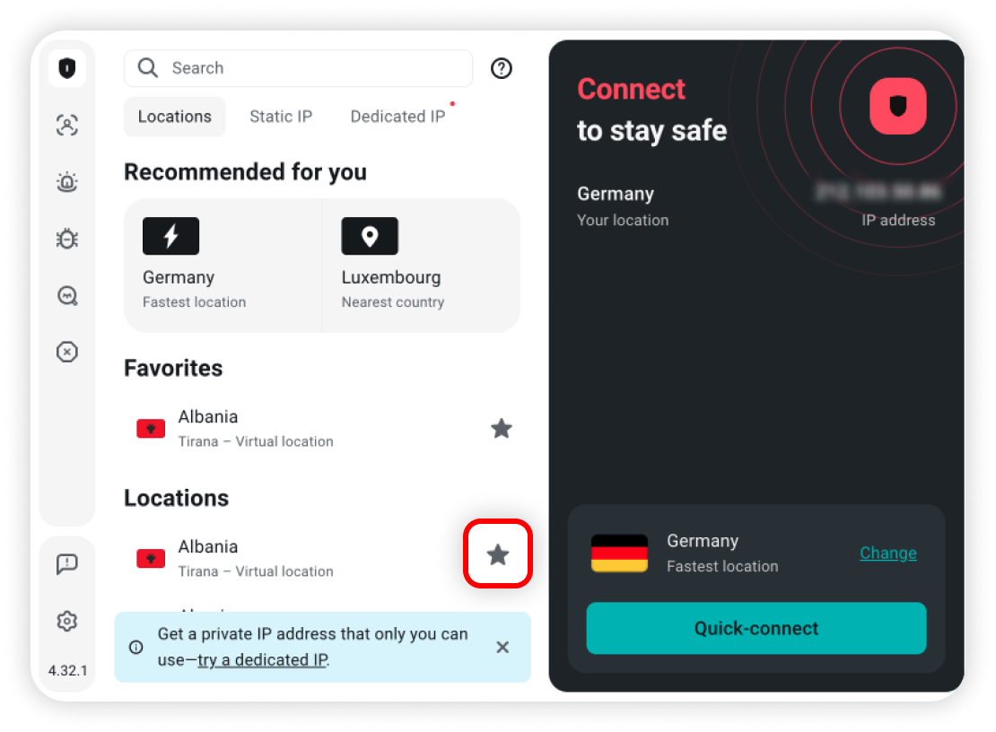 • Configure which country you connect to when you press Quick-connect:
