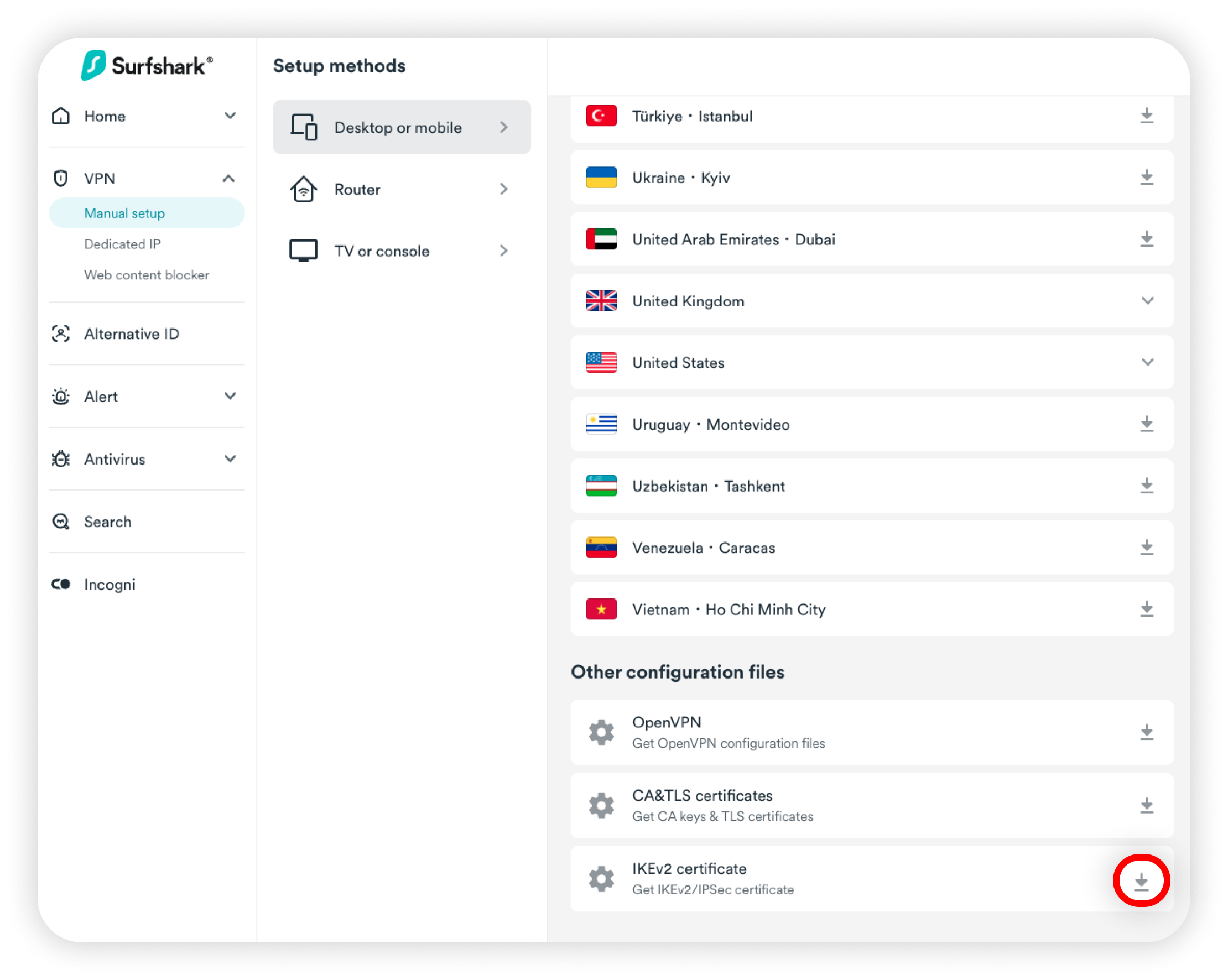 6. Scroll down to Other configuration files and locate the IKEv2 certificate. Click the download button to download the certificate file: