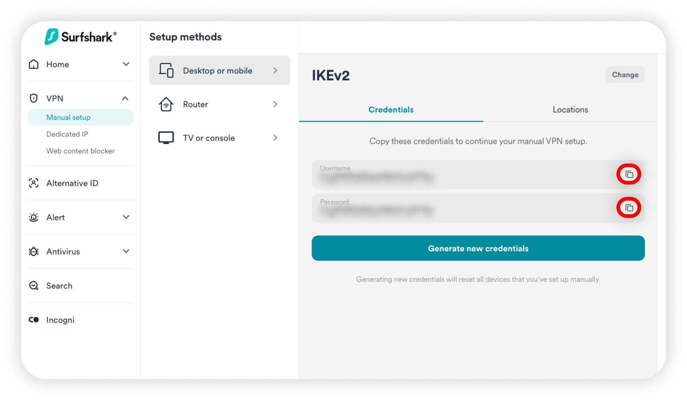 4. Click IKEv2 to generate your credentials: