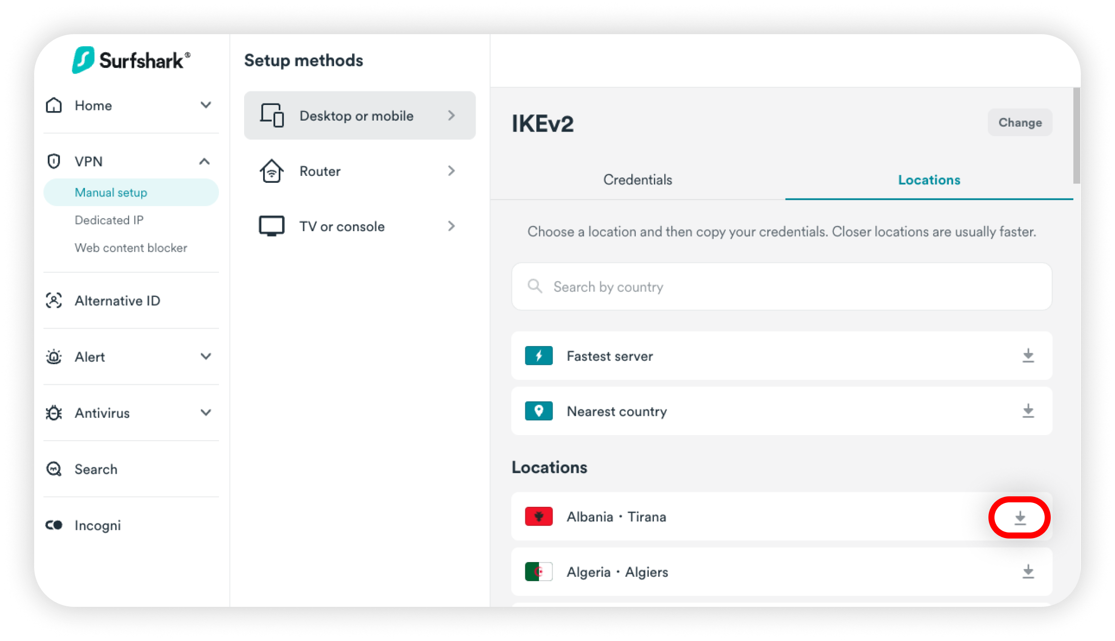 6. From the location list, find the server you wish to connect to and click the Download button beside it: