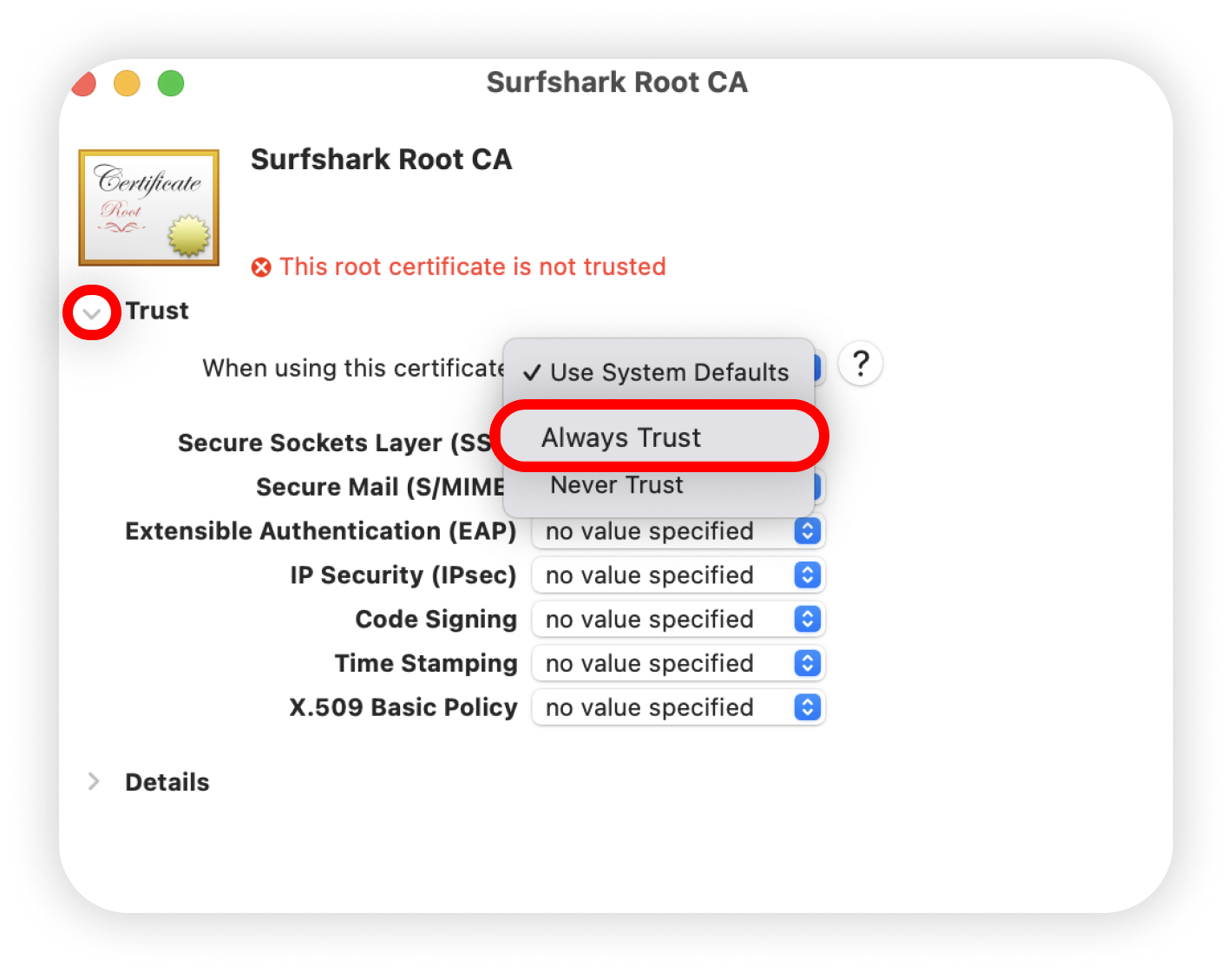 11. Expand the Trust section by clicking the triangle. Next to When using this certificate, select Always Trust: