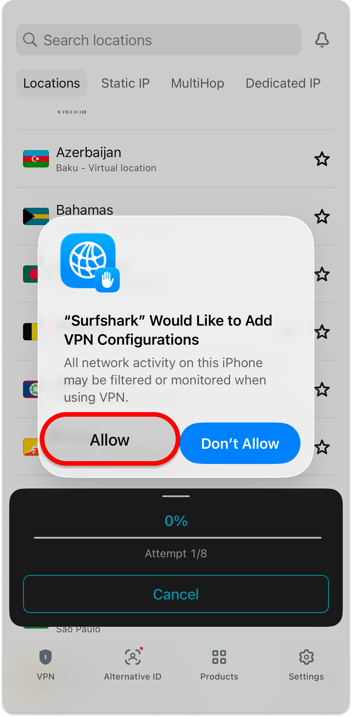 1. When making a VPN connection for the first time, Surfshark will need to add VPN configurations to your device. This is necessary for Surfshark to create and manage the VPN tunnel.