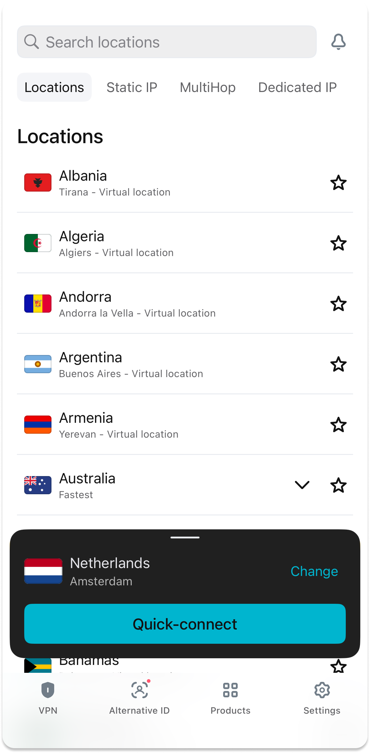 To manually choose a server, go to the locations tab. You will find the full list of Surfshark locations. Tap on the flag icon of your preferred location to connect to it: