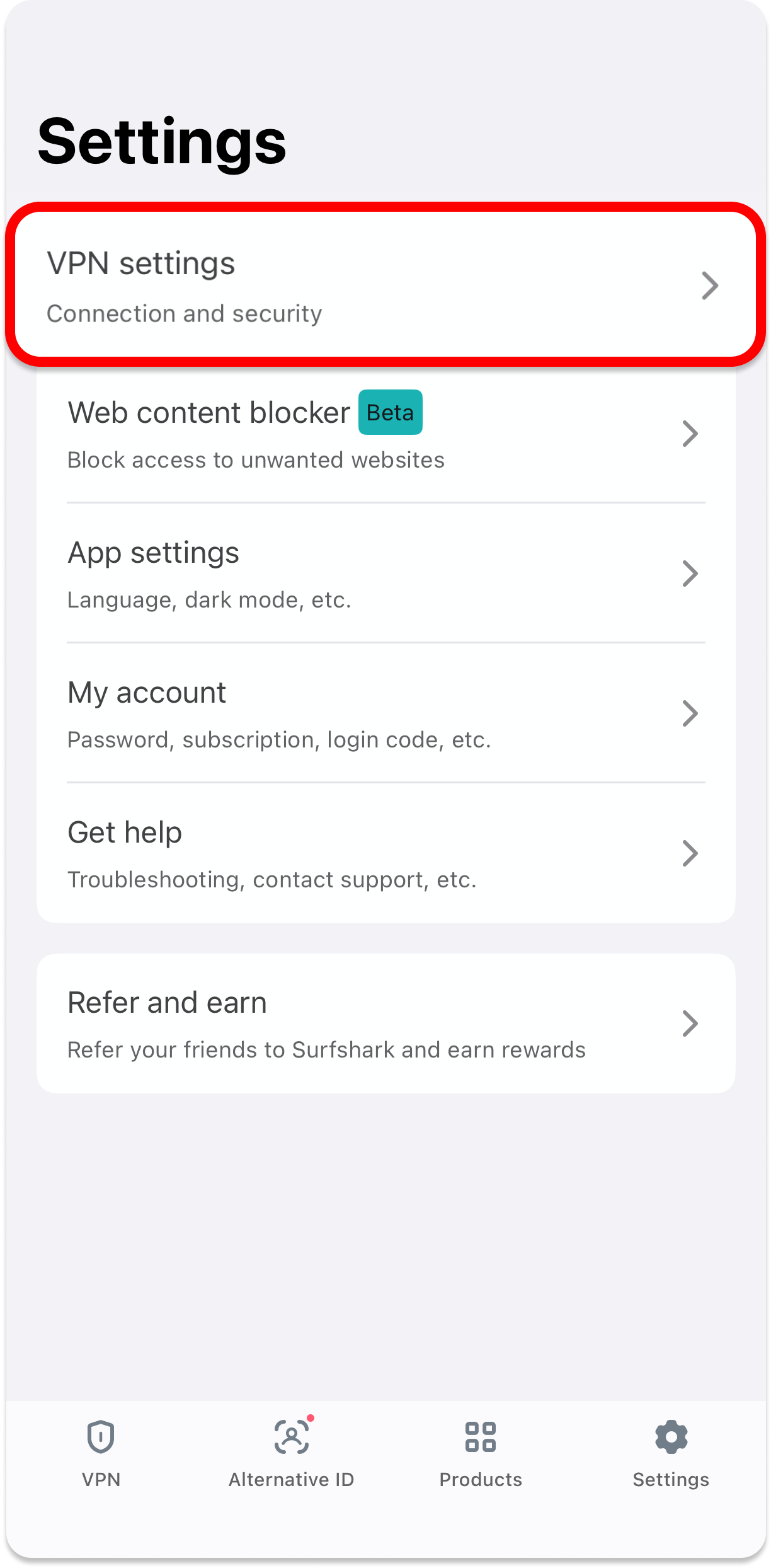 Manage the Surfshark app according to your preferences. Open the settings tab at the bottom right: