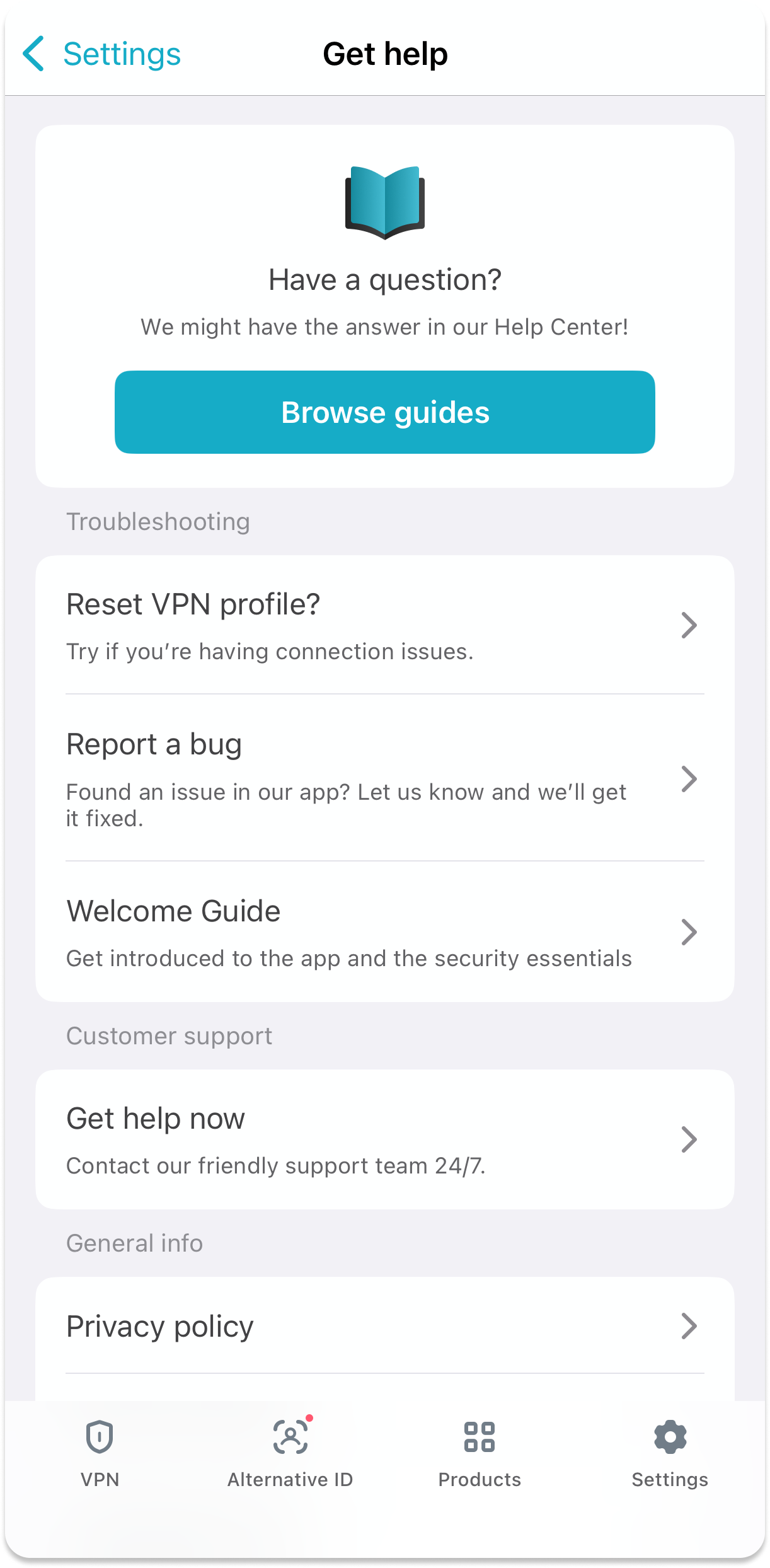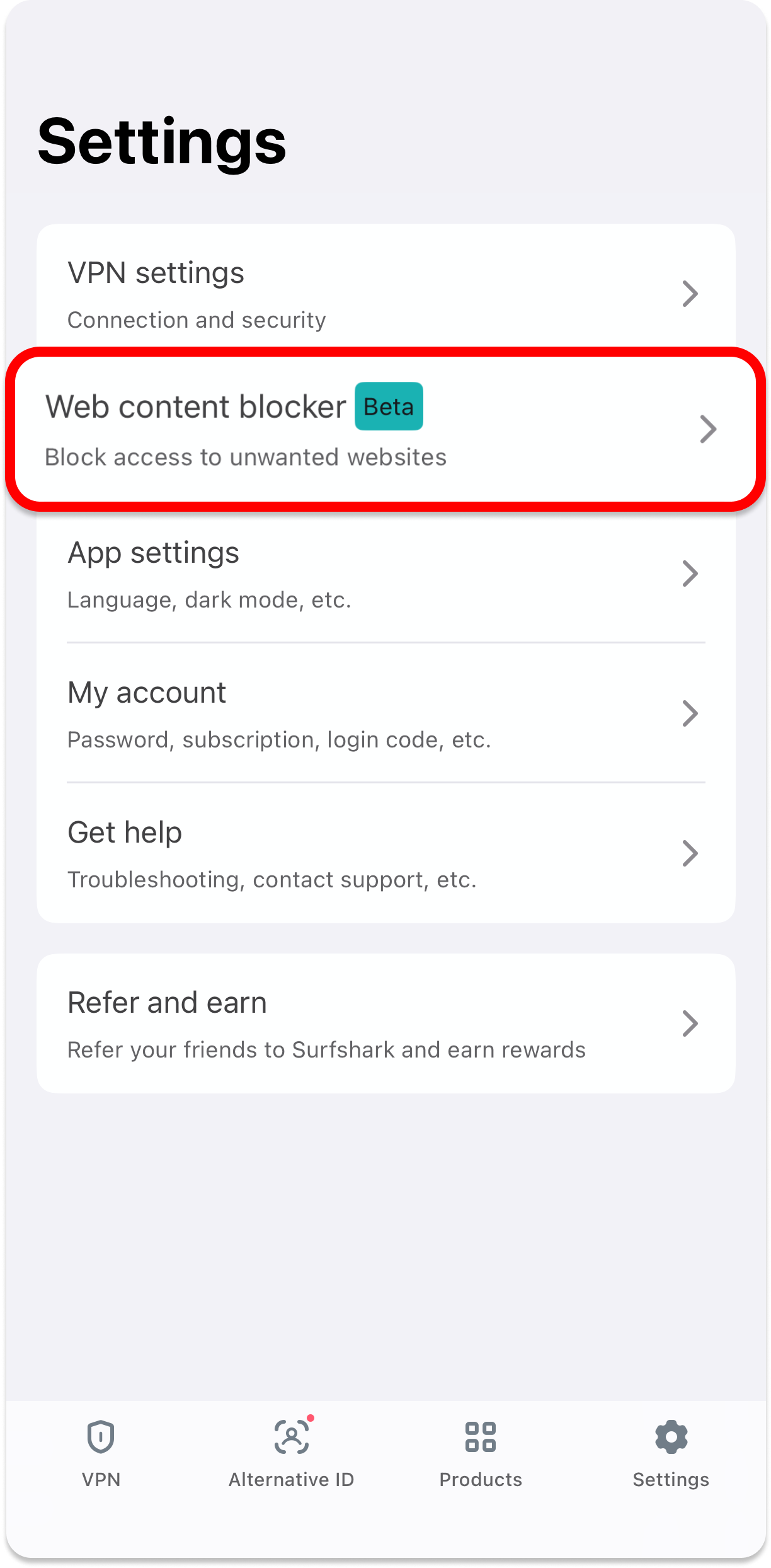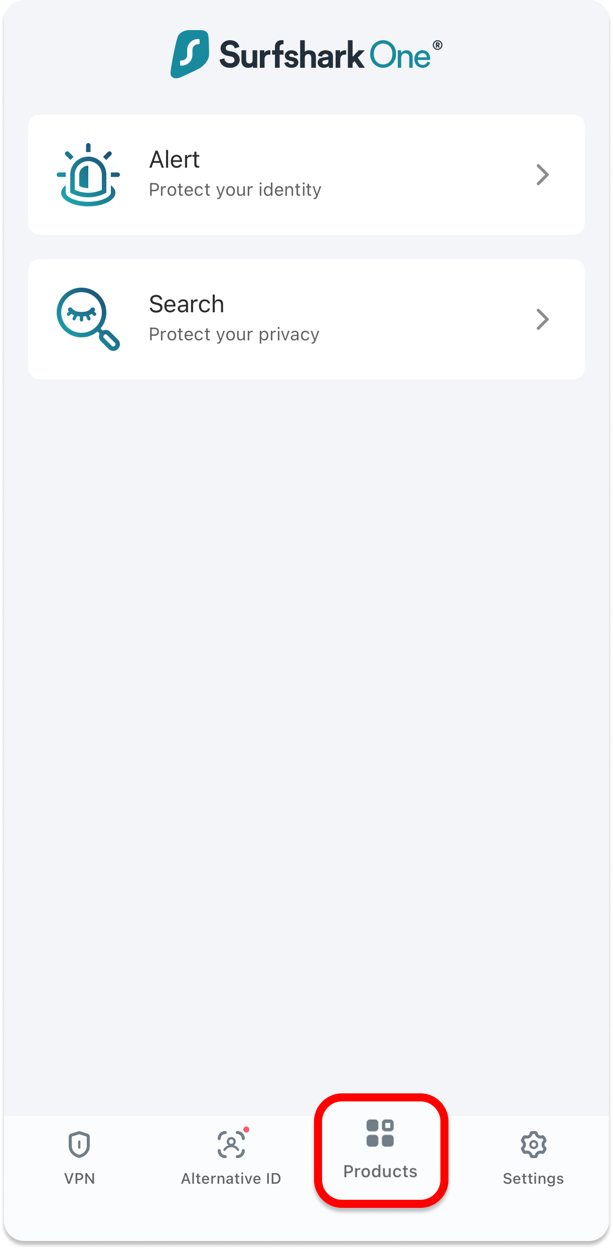 Open the Products tab in your Surfshark app, where you will find two Surfshark products. To use them, you have to have an active Surfshark ONE subscription: