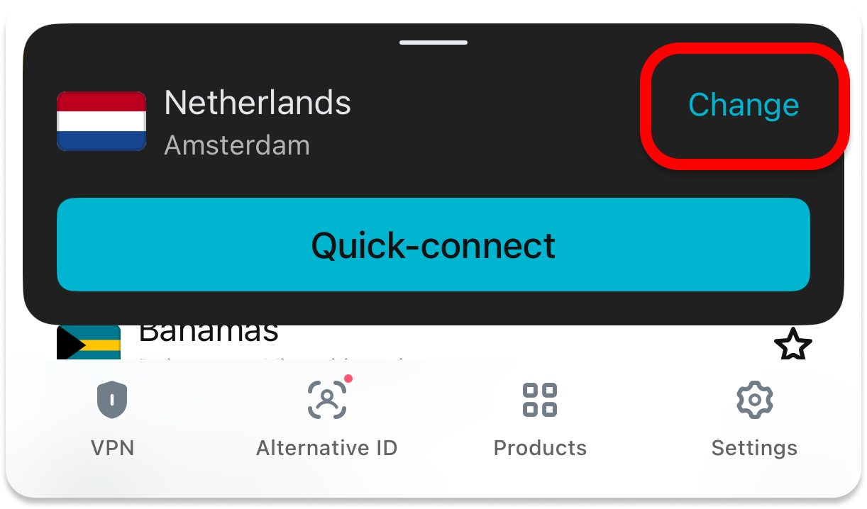 3. You may also choose the fastest server or the nearest country as your default location. To do that, tap the change button: