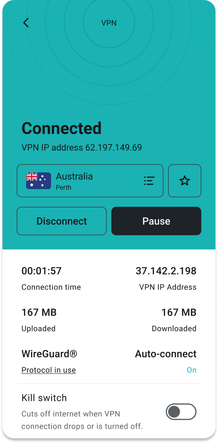 You'll then be able to see your VPN IP address, the VPN protocol in use, and enable or disable the Kill switch feature.