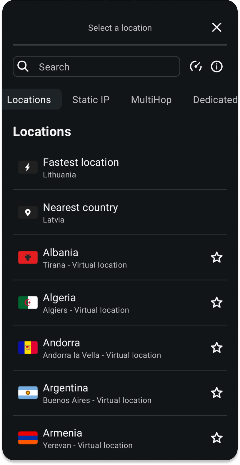 Choose the fastest server or the nearest country, or scroll down and pick a server from the locations list: