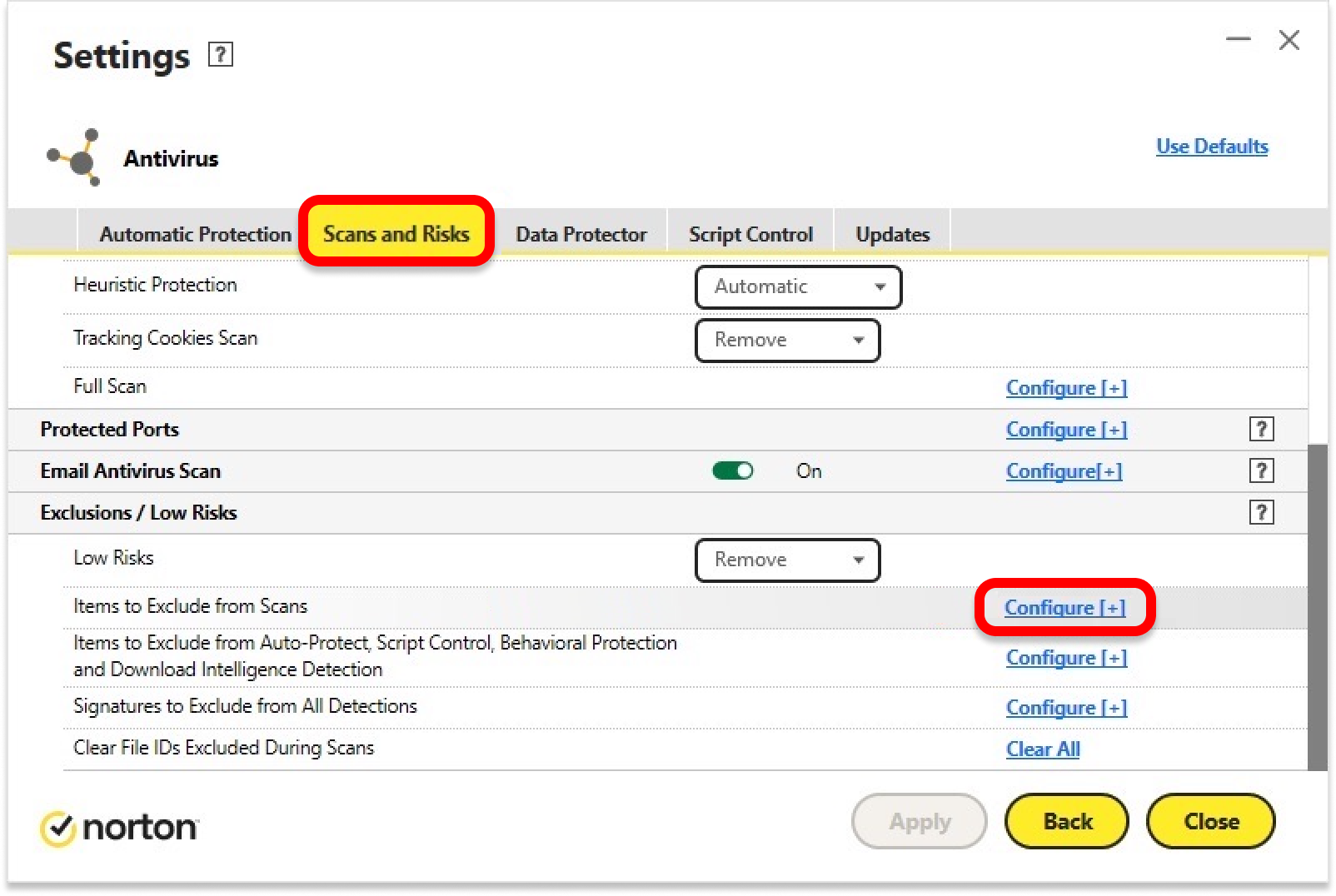 Once you are in the Antivirus settings menu, click on the Scans and Risks tab, scroll down to the bottom, and click on Configure next to Items to Exclude from Scans.