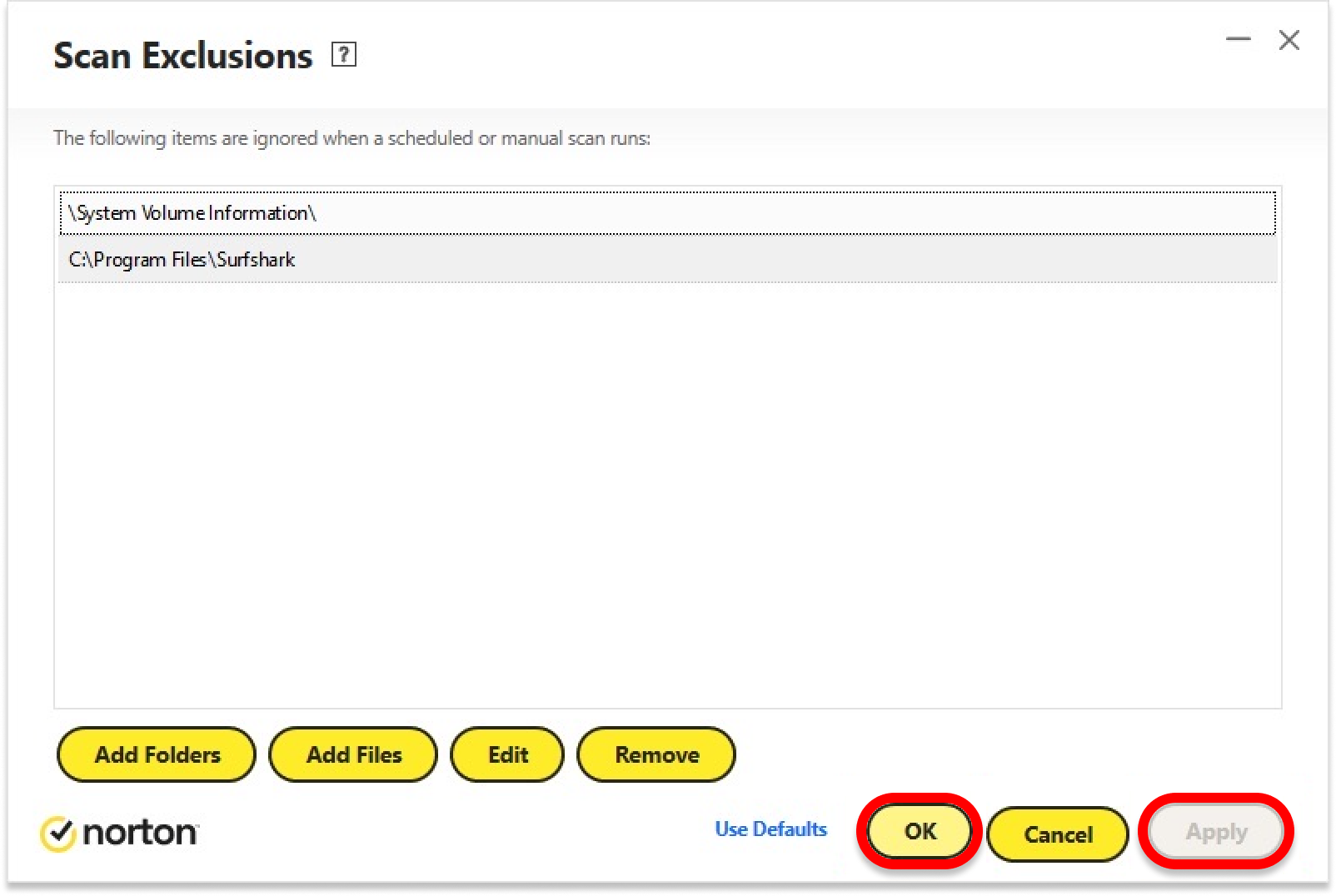 Now, the pathway to Surfshark's folder should be visible in the Scan Exclusions window. All that is left to do is to press Apply and OK to save the exclusion you have just added.
