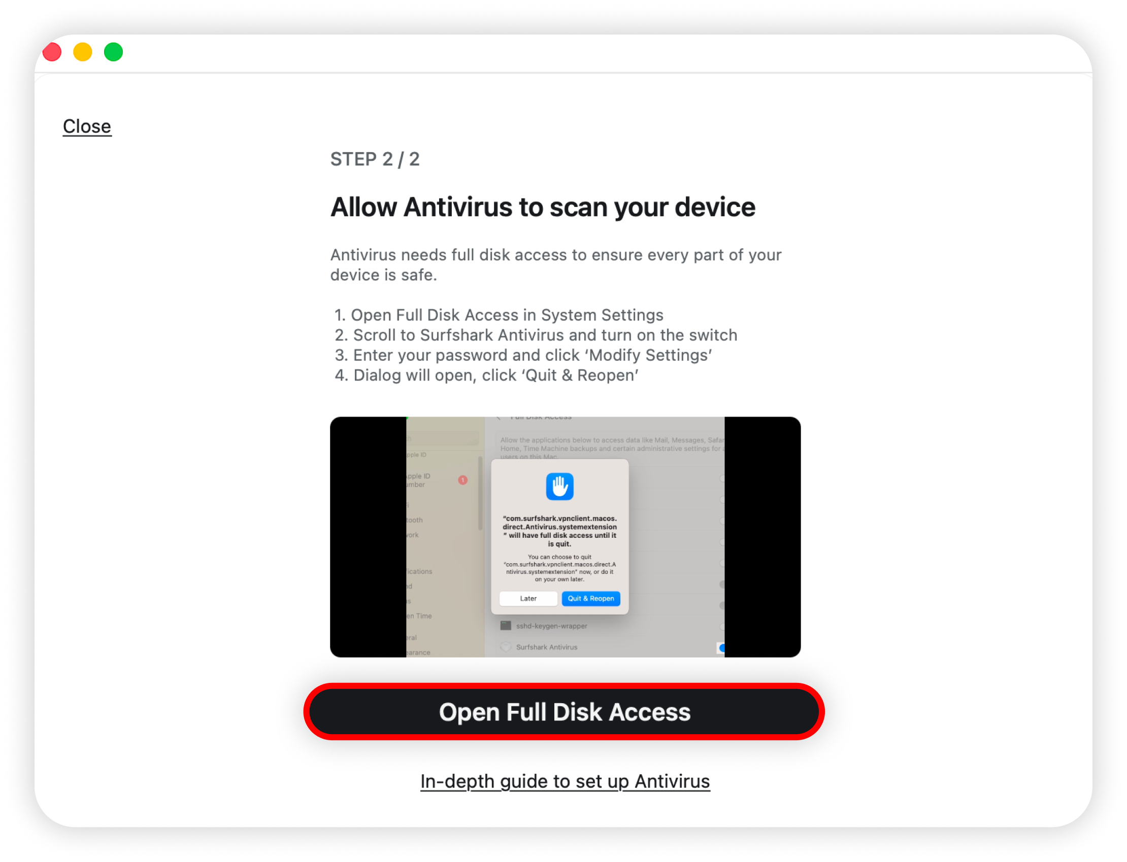 NOTE: Surfshark Antivirus is available only in the .DMG version downloaded from our official website and is not supported in the App Store version of the Surfshark app.