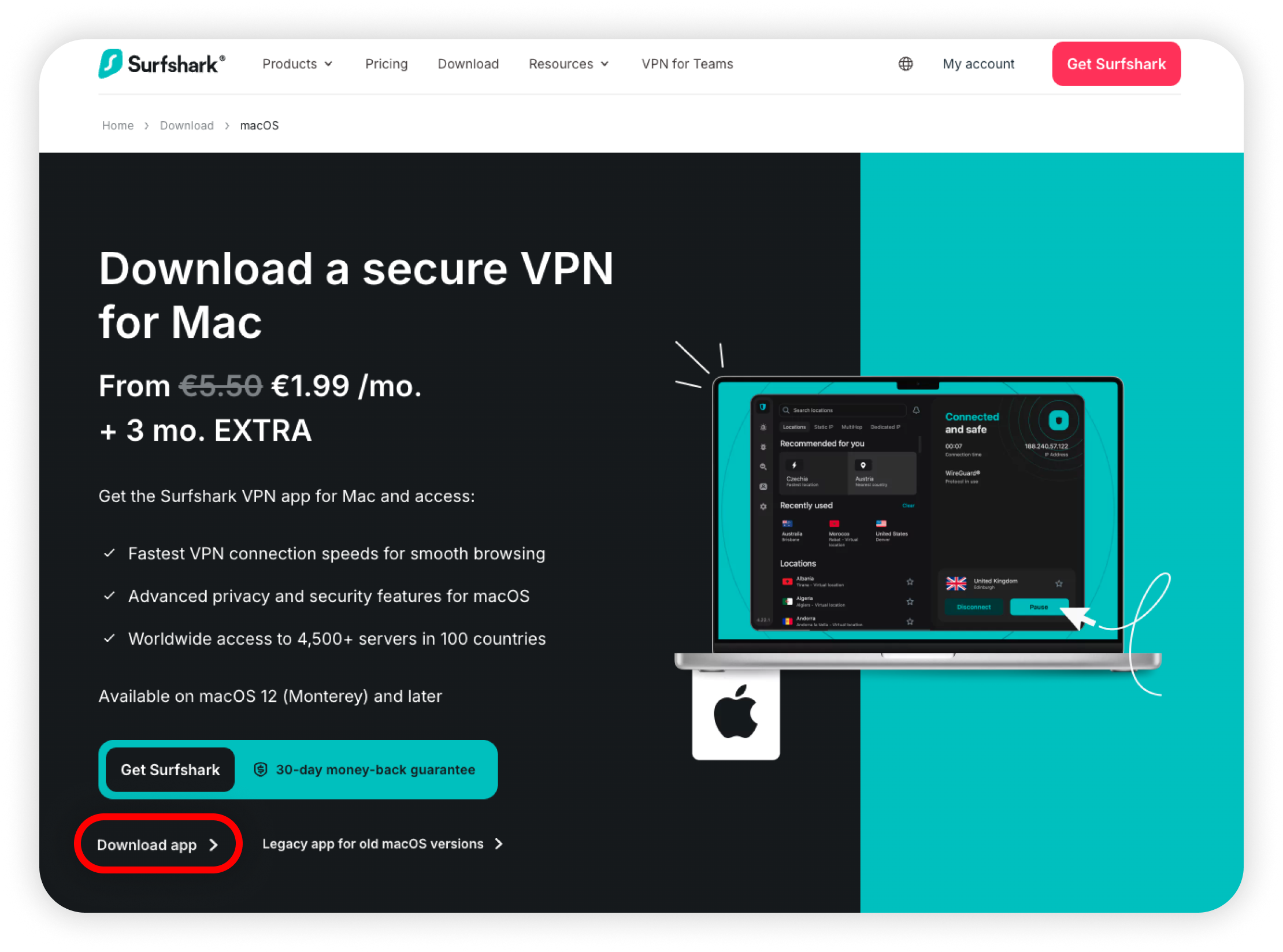 Go to the Surfshark download page for macOS and download the .DMG version of the Surfshark app: