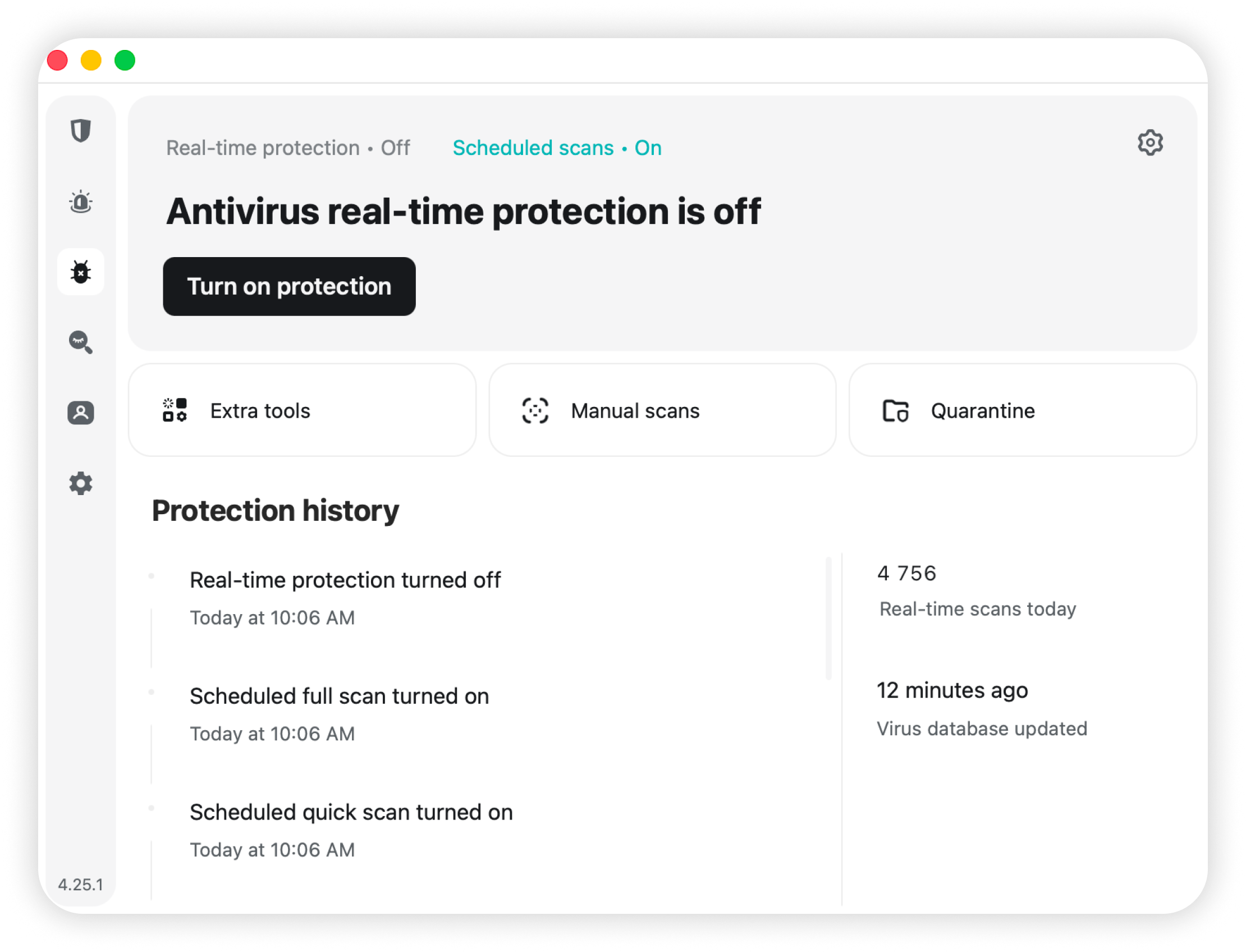 After the scan is complete, you’ll see the main Antivirus dashboard. Click Turn on protection to enable continuous protection: