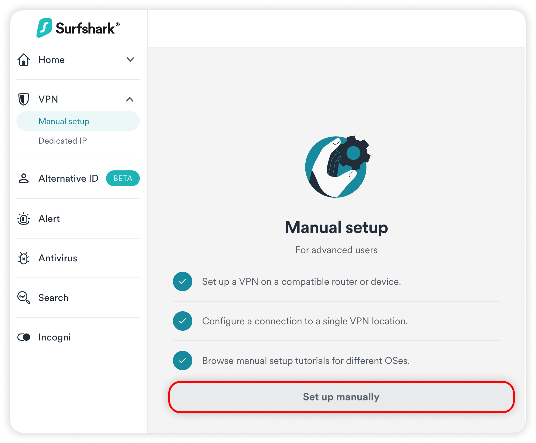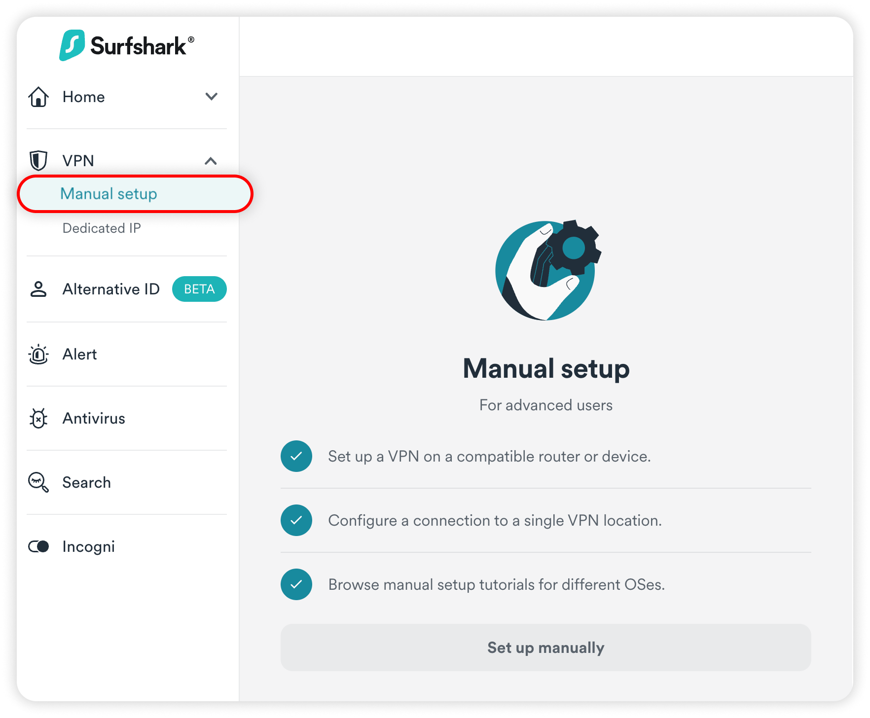 - Head to the Surfshark login page and log in. Then, click on VPN -> manual setup.