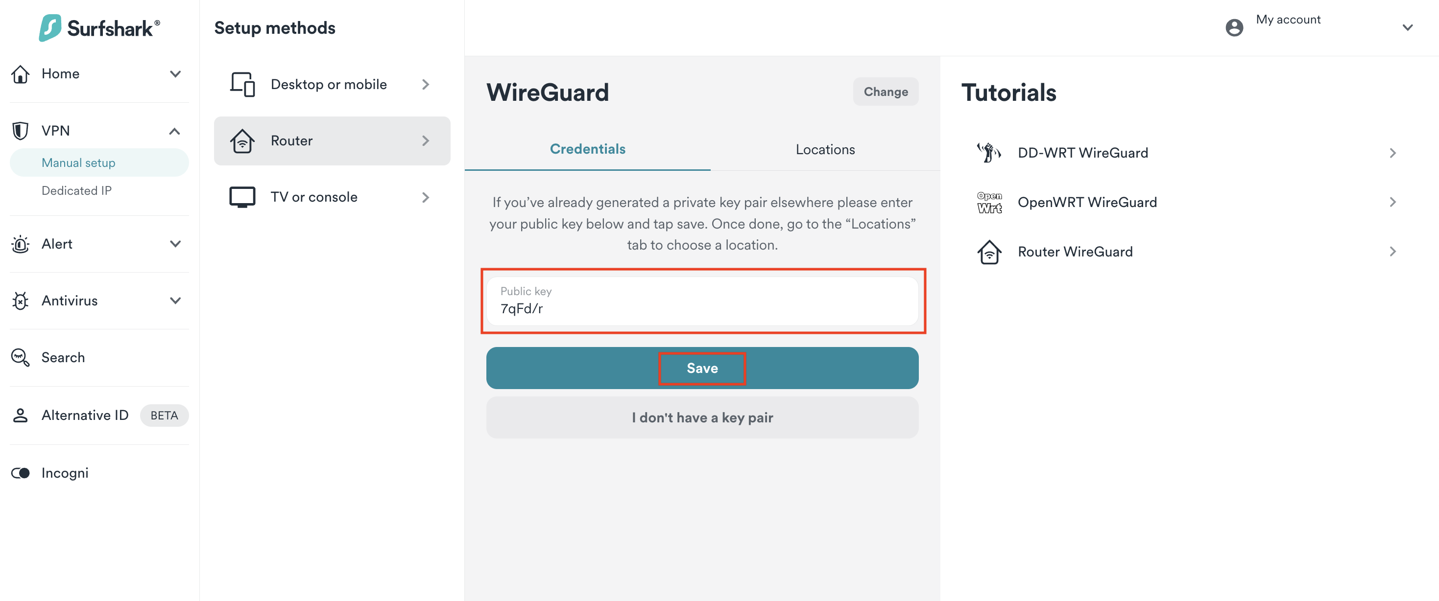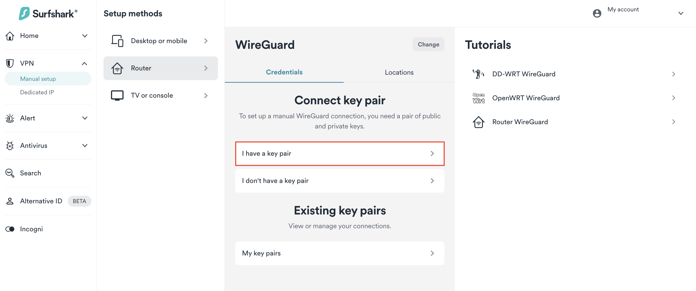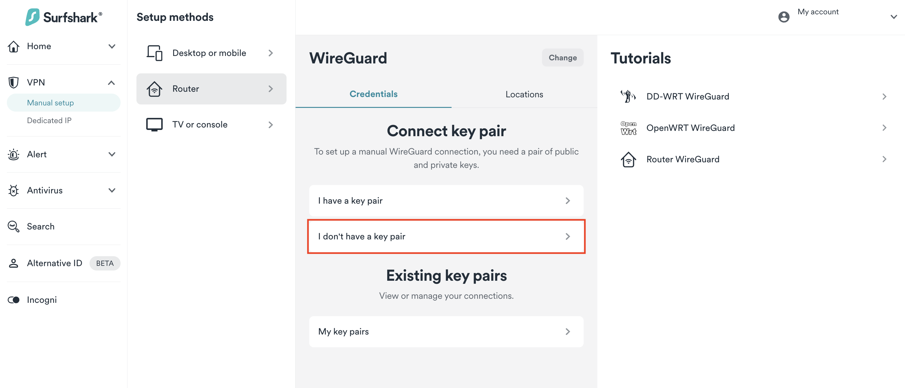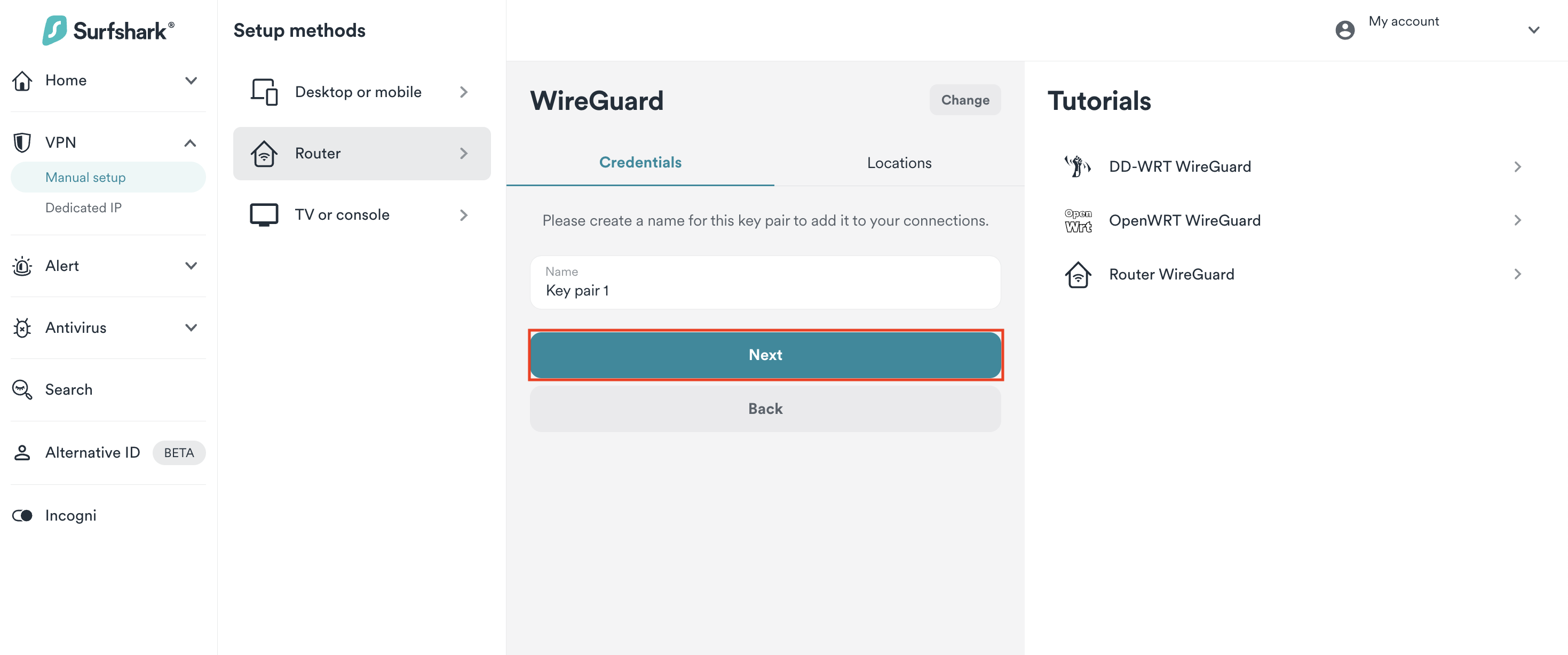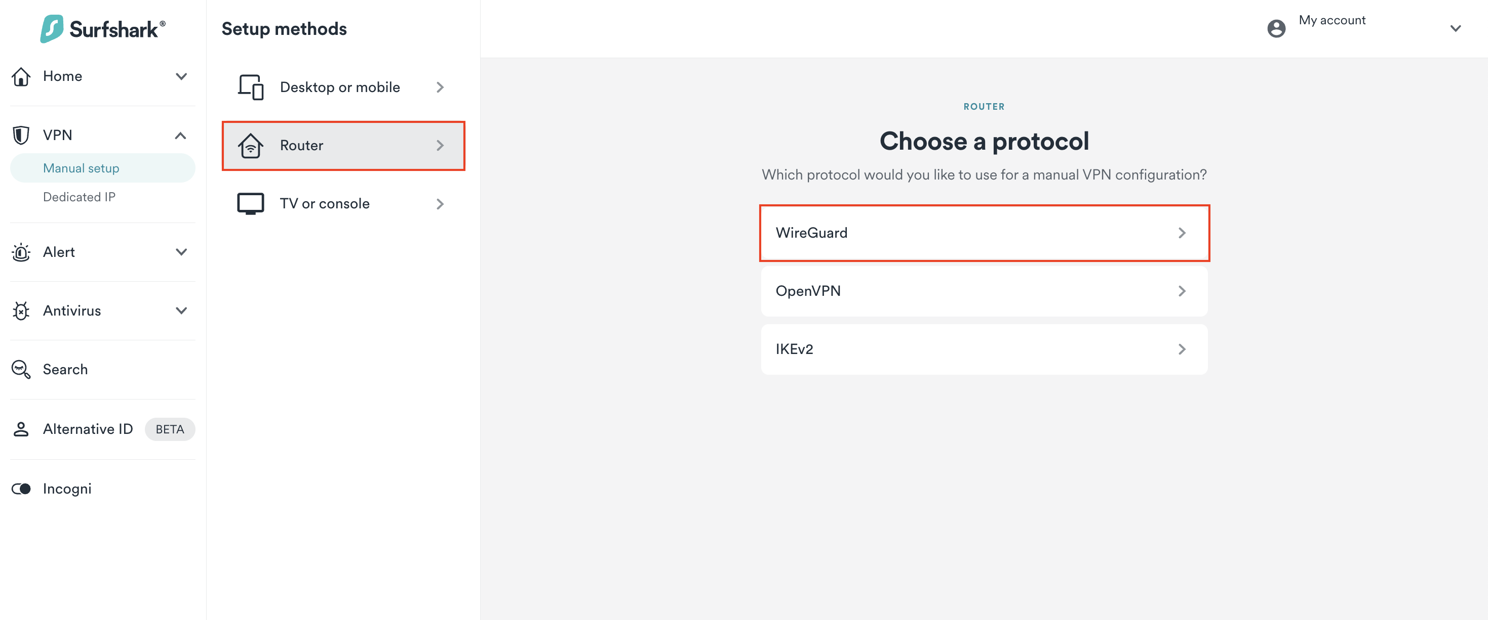 1. Go to Surfshark's login page and log in. Then, visit VPN > Manual setup. Choose the Router option and click on WireGuard.