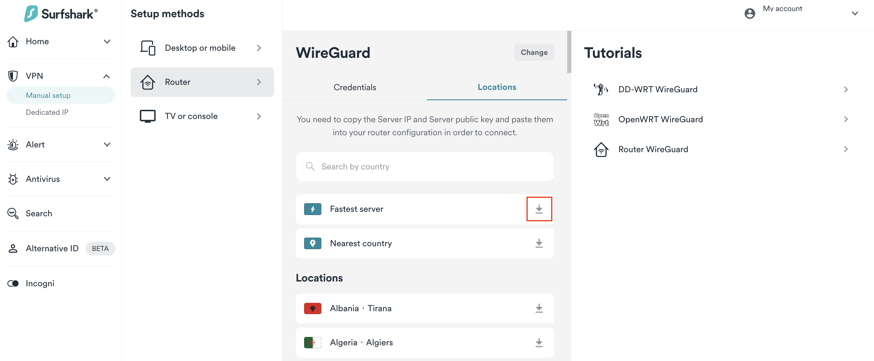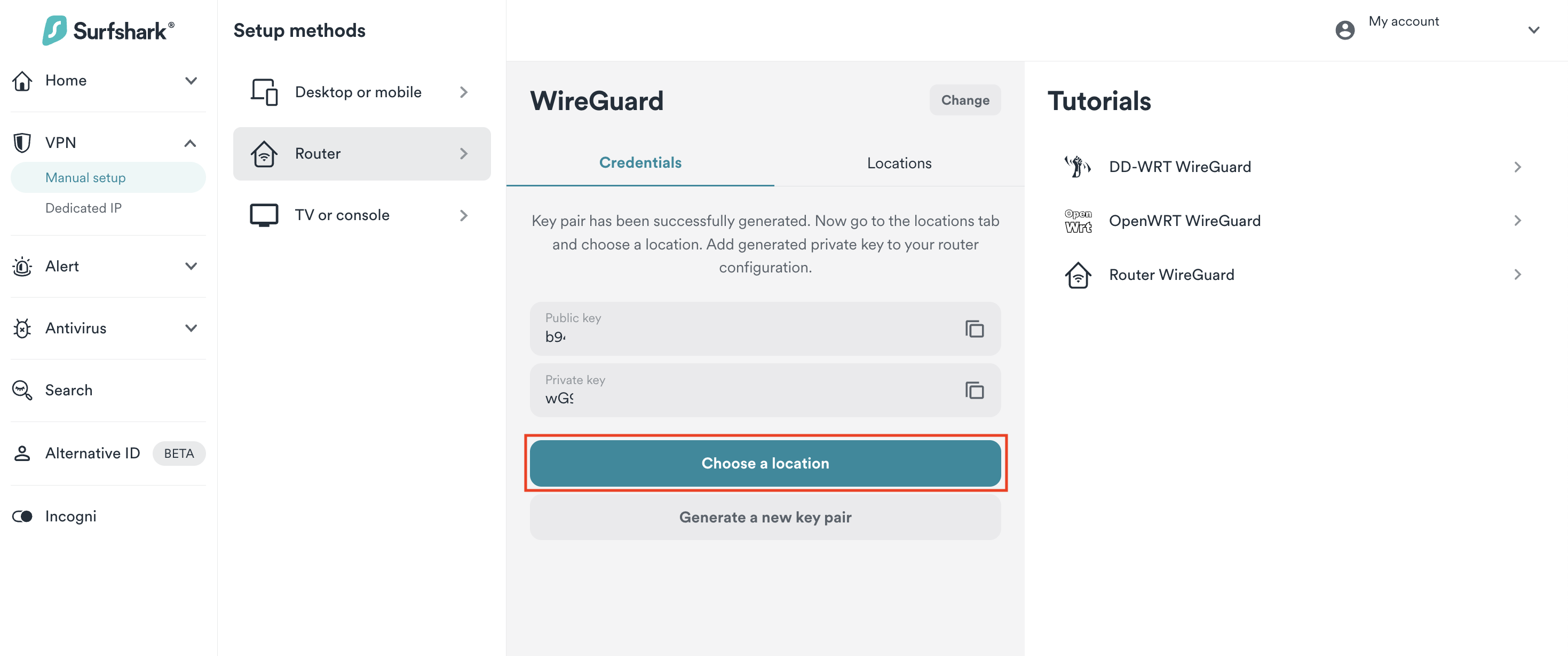 Once you have your key pair, you should see a Choose a location button. Click on it. Here, you'll find the list of available locations to connect to. Select one and hit the download button.